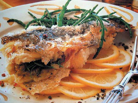 在烤鱼时放上一层粗粒海盐, 烤熟以后再把海盐去掉,这样最大程度地保持了食材的原味,还带着海洋的味 道和淡淡咸味,更突显食材的鲜甜。
