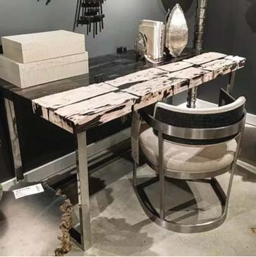 Brynn O1son 认为, 展会上奢华的织物采用天然材料手工编织, 压印几何图案, 搭配金属点缀, 视觉上很大胆, 这是不会过时的风格。 如 Pa1ecek家具的克罗斯比桌子, 硅化木和钢的