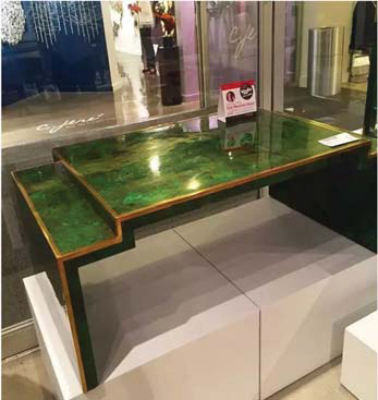 Miche11e Jennings Wiebe 认为, 一些新品的设计趋势是黑檀木映衬出镀金拉手的闪亮,蛇纹皮革为拉丝黄铜、青铜镜面和黑白大理石加人了大胆精致的格调,黄铜带扭成环形盘旋而起, 每一个细节都很和谐。 如 SHO 现代滑轮车,金色和大理石色的搭配,典雅而高贵。 而黑色和 金黄 色的 搭 配 , Thumprints 的 吊灯 以及 Hancock & Moore 的柜子,是家具中的经典款。 还有 Caraco1e 的桌子, 黑色和金色的搭配如绅士般优雅, 夸张的弯曲桌角像穿着明亮的金色靴子一般, 仿佛桌子在跳舞,非常优雅。