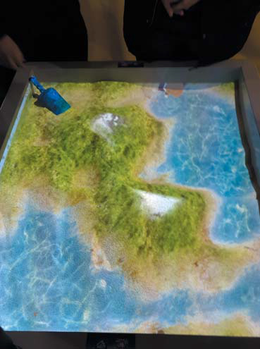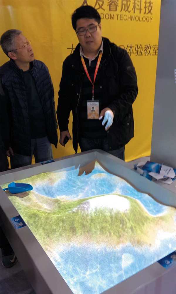 在北京大友睿成科技展台, 许多观众围在 AR 地理沙箱旁, 沙箱里展示的是高山和海湾, 山谷中蝴蝶飞舞, 山顶上雄鹰展翅, 波光粼粼的海水让人感觉身临其境, 记者用手把沙堆分开, 画面立刻由一 座山变成两座山,中间变成了河流。 工作人员讲,AR 地理沙箱是采用地 形 捕 捉 系 统 搭 载 微 软Kinect3D 体感技术的增强现实互动产品, 可以实现投影的成像随着沙堆高度的增加而逐渐呈现出海岸、海湾、湖泊、河流、岛屿、陆地、高山和雪山等地形效果;通过加载识别模块,调取三维程序动画及地貌形成科普视频, 增强地理沙箱的演示效果。 AR 地理沙箱加载识别模块能够实时调取三维程序动画或地貌, 形成科普视频大大增强了地理沙箱的内容含量。
