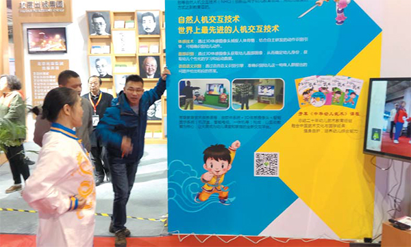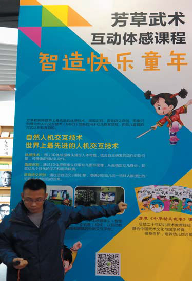 一位身着太极服的家长在体验芳草武术互动体感课程, 该课程将最先进的体感技术、面部识别、语音语义识别、 图像知识等自然人机交互技术(NHCI )创新应用于幼儿教育领域, 用幼儿喜爱的方式达到教育目的。工作人员介绍,芳草武术互动体感课程,由软件系统+3D 体感摄像头+ 智能显示系统( 机顶盒、智能电视、一体机等)构成, 以互动教育为核心,让大屏成为幼儿课堂和家庭的全新交互平台, 芳草《中华幼儿武术》课程总结二十年幼儿武术教育经验,融合中国武术文化与国学经典, 具有强身自护, 培养幼儿综合能力。
