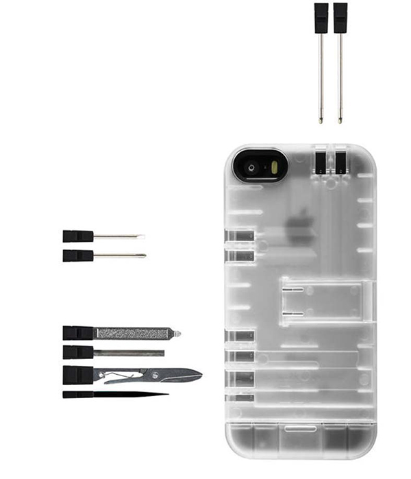 这个奇奇怪怪的手机壳由 In1 Case 设计,将手机瞬间变身为小型 工具箱。透明的塑料外壳,内部的凹槽中藏有小型螺丝刀 、指甲剪、开瓶器、牙签 、剪刀、支架等, 几乎可以 满足所有日 常工具需求, 这些工具在手机壳中整齐排列,取出也很方便。因此这款手机壳的适用人群十分广泛, 用来防身是不错的选择。