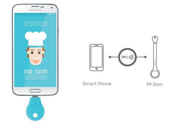 Joongu Kim设计的Mr.Sam勺子 能够通过内置的离子传感器来测量食 品中的盐含量,并通过APP与智能手 机”连,在APP中不仅可以读到食物 中的含盐量,还能根据饭量来计算每 天的钠摄入量,十分专业。