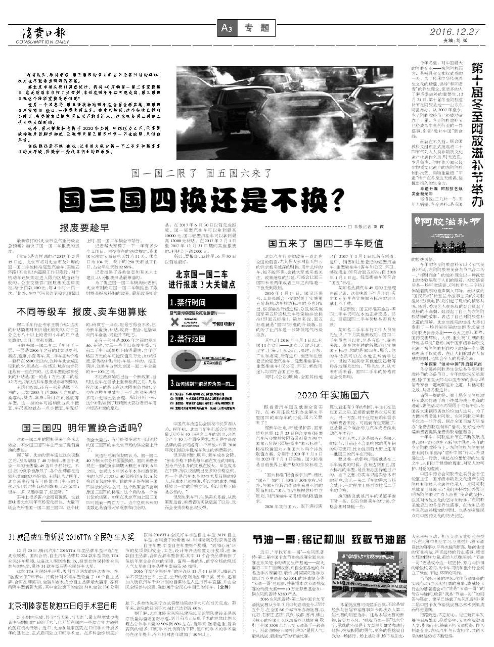 前有追兵,后有来者,国三国四的车主们当下是很纠结的群体,本文也不能给出明确的答案。 据北京市相关部门调查统计,将有40万辆国一国二车置换新车,这无疑给车市打了兴奋剂,车价在明年年初可能走高,国三国四车凑这个阶段置换是否值呢? 但另一个消息是,国五排放标准明年在全国全面实施,即国四车不再销售、进口,一律要卖国五车。在重点地区,这个标准已提前实施了,有些地方已限制国五以下的车迁入。这意味着国三国四二手车将大幅贬值。 此外,国六排放标准将于2020年实施,环保压力之下,汽车排放标准升级脚步加速,没准哪天国三国四咔嚓一下也被限,只值白菜价。 到底换还是不换,在此,记者给大家分析一下二手车和新车车市的大环境,再提供一些汽车行业的新政策。 □ 本报记者 刘 微 报废要趁早 最新修订的《北京市空气重污染应急预案》加快了国一国二车报废的速度。《预案》是这样说的:“2017年2月15日起,北京市将对北京市及外埠的国一国二排放标准轻型汽油车,实施五环路(不含)以内道路工作日限行。对于机动车违反规定进入限行区域道路行驶的,公安交管部门按照相关法律规定,给予罚款100元、每4小时计罚一次。”此外,在空气污染达到橙色预警以上时,国一国二车辆全市禁行。 记者帮大家算了一下一年有多少个工作日。根据现在的法律规定,我国国家法定节假日总天数为11天,休息日为104天,剩下的250天都是工作日,占全年总天数的68%。 记者搜集了各类信息和有关人士建议,认为报废掉是最靠谱的。 为了促进国一国二车辆淘汰更新,北京市财政对国一国二车辆推出了限时提高报废补贴的政策。最新政策规定是:在2017年6月30日以前完成报废,国一轻型汽油车可以拿到最高10000元、国二轻型汽油车可以拿到最高12000元补贴。在2017年7月1日至2017年12月31日期间实施报废的,补贴会下调2000元。 所以,要报废,就趁早,6月30日以前是最好。 不同等级车 报废、卖车细算账 据二手车行业专家王萌介绍,这次的补贴额相对来讲是比较高的,对于百分之七八十以上的老旧小车的用户是划算的,比自己卖都划算。 王萌将国一国二车二手车分了三层,一层是2006年之前的比如说夏利、奥拓、富康、小面等车,其二手车正常价格一般都在6500元以内,这种车北京城区见到的少,但是在一些郊区、城乡结合部还是有一些在用的。这类车型能够享受到的补贴是,国一的是1万元,国二的是1.2万元。所以这种车报废是非常划算的。 王萌介绍说,还有一部分是属于不亏的,比如2003年到2006年之间的,桑塔纳、捷达、富康、马自达6、雅阁等车型。这一类的车可能稍微占点小便宜,车况差的就占一点小便宜,车况好的,稍微亏一点点,但是亏得也不多,因为新车置换、补贴,政府一配合,包括做点汽车金融,可能并不吃亏。 还有一部分是2006年之前的奥迪A6、奔驰、宝马一些老旧高端车型,当前二手车市场价格下降得最快,当年价格百万元的车可能仅值几万元;如果报废,获得的补贴和小车是一样的。据王萌讲,这类车占到北京国一国二车总量的5—10%之间。 不过政府随后出台一个新政策,当时这些车在目录上重新检测之后,凡是符合国三的是不在这次限制条件的,至少在这种车里减少了一半,相对来讲很多用户觉得比较合理。所以分析下来,这个补贴做到了照顾到大部分老旧车用户经济补偿的原则。 国三国四 明年置换合适吗? 对国一国二车的限制带来了多米诺效应,不少国三国四车主产生了提前置换的想法。 据了解,北京的新车通过这次调整之后,因为增加了40万辆车,相当于北京一年的销售量,4S店日子都好过。不过,因为竞争也激烈了,各个品牌都在抢额外增加的这些份额。王萌认为,“明年,北京新车行情有可能像过山车似的变化,刚开始时车商都打算囤点,赶紧卖;但车一多,又砸手里了,赶紧降。” 实际上很多客户会提前置换,也就意味着北京明年市场变化很快,大量市场会充斥着国一国二国三国四,这个比例会大量占,有可能很多地方可以流转的国三国四的车北京市场的供应量上升了。 网通社总编向朝晖认为,国一国二40万辆大部分都要置换的。国内消费者现在一般的换车周期大概在5年到6年之间,如果这5年到6年本身打算要换车的人群,比如从A0级换到A级,A级换到B级的车主,他的车正好在国三国四排放的标准之间,这个政策会不会刺激国三国四的标准?这个真的是一个要讨论的话题。如果在北京市加上国三国四可能就一两百万了,这个空间未来的变数还是值得大家观察和讨论的。 中国汽车流通协会副秘书长罗磊认为,明年初,北京市新车市场会突然放量,因为有40万辆老旧车的退出,必然会产生40万个置换需求,尤其是中高端品牌的需求可能有一个释放,不像2016年我们是以中低端车为主的消费需求。 但罗磊判断,明年,新车成本会降。“新车价格下降是每年都在发生的事情。因为产品本身的规模在放大,单位成本在下降,所以说能腾出更多的价格空间。再一个是汽车本身的技术及前期的投入,使成本已经摊薄,所以它的成本也腾释放出一定的价格空间,所以价格下降是必然的。” 但反映到车市,从供需关系看,从政策促进看,消费者购买欲望强了以后,反而会使得价格出现反弹。 国五来了 国四二手车贬值 北京汽车行业的政策一直走在全国的前面,尤其是大家对蓝天白云的诉求越来越深的时候,用什