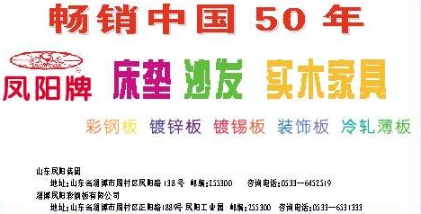 彩钢板 镀锌板 镀锡板 装饰板 冷轧薄板 山东凤阳集团地址:山东省淄博市周村区凤阳路138号 邮编:255300 咨询电话:0533—6452519淄博凤阳彩钢板有限公司地址:山东省淄博市周村区正阳路1889号凤阳工业园 邮编:255300 咨询电话:0533—6531333