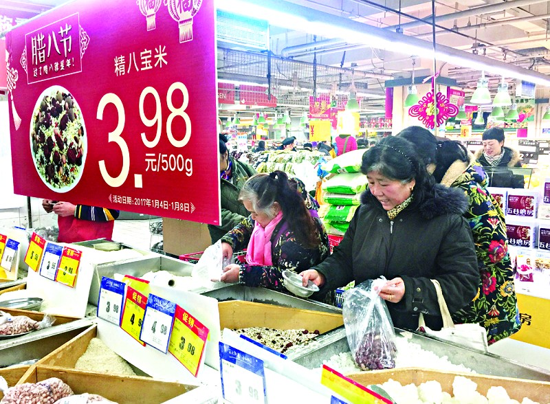 今天是“腊八节”,一些地区有喝腊八粥的习俗。记者走访北京区多家菜市场发现,不少粮油摊位的最显眼位置都摆放了煮腊八粥的腊八米。图为消费者在朝阳门菜市场采购腊八米。 本报记者 陈丽光 摄
