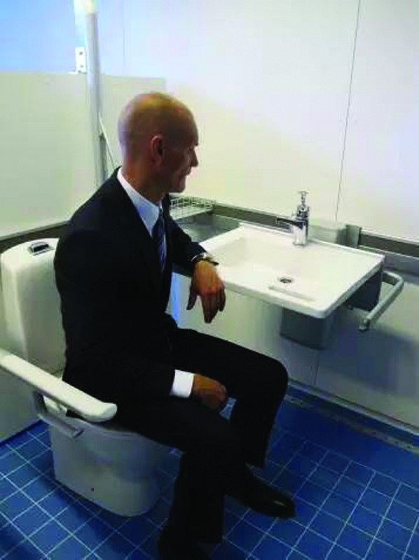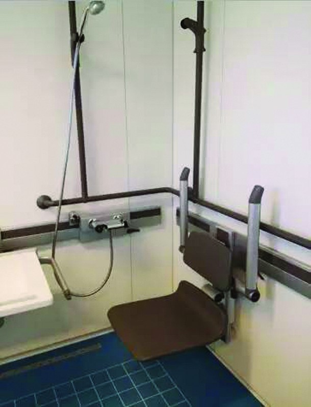 图为丹麦某厂商的洁具设计,是将各类卫生间设备安装在预先设置的墙轨上,以实现洗手池、淋浴凳、扶手等的灵活调节和移动。如图所示,老人可以调节淋浴凳的高度来适应自己的身高;洗手池的位置也可以灵活移动,老人在如厕时若将手弄脏,就可将洗手池拉至自己身前就近洗手;当需要护理人员协助起身时,又可以将洗手池移开,以腾出足够的侧方空间供护理人员进行操作。 性价比不高