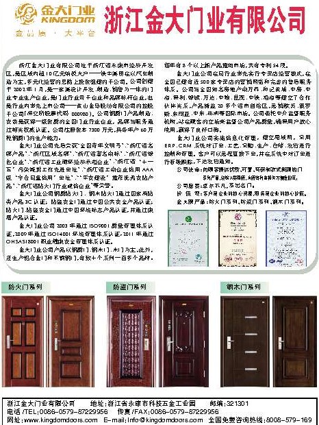 公司使命:向顾客提供优质、可靠、环保和款式新颖的门 系列产品,装饰人类居所,为所有利益相关方创造价值。 公司愿景:卓尔不凡,系出名门。价 值 观:客户是企业的核心资源,服务是企业的核心价值。金大牌产品:防火门系列、防盗门系列、钢木门系列。 防火门系列防盗门系列钢木门系列浙江金大门业有限公司 地址:浙江省永康市科技五金工业园 邮编:321301电话/TEL:0086-0579-87229956 传真/FAX:0086-0579-87229956 网址:www.kingdomdoors.com E-mail:Info@kingdomdoors.com 全国免费咨询热线:8008-579-169