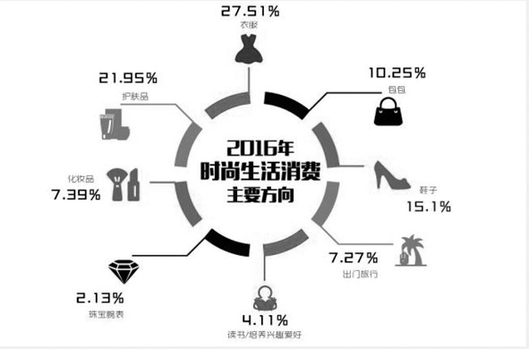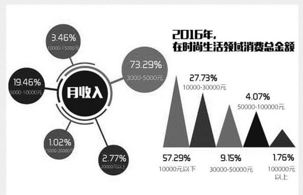 根据调查显示,2016年网友在时尚生活领域的消费金额呈现出金字塔形状,一半以上的网友处于“谨慎型消费”的阶段,年时尚消费金额在10000元以下;年时尚消费金额在10000元-50000元的网友占比36.88%;年时尚消费能力在50000元以上的网友占到5.83%,其中年消费10万元以上的“土豪网友”占比1.76%。