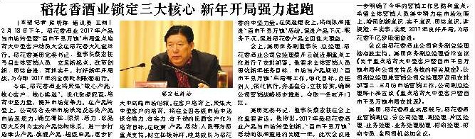 (本报记者熊晓琳 通讯员王翔)2月18日下午,稻花香酒业2017年产品与市场转型暨“百市千县万镇”布局重点培育大中型客户动员大会在稻花香大礼堂举行。稻花香集团党委书记、董事长蔡宏柱号召全体营销人员:立足新起点,改革创新、团结奋进、真抓实干,打好新年开局战,为夺取2017年的全面胜利砥砺前行。