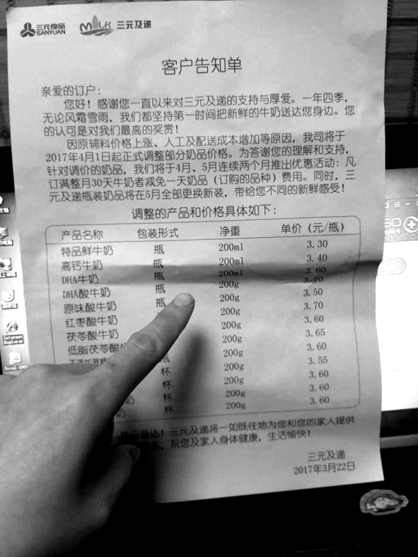 3月底,记者接到三元集团的一张“客户告知单”,根据告知单,从2017年4月1日起,三元奶品的13款产品价格全线上调。据悉,这是三元集团今年首次对旗下产品价格做出调整。