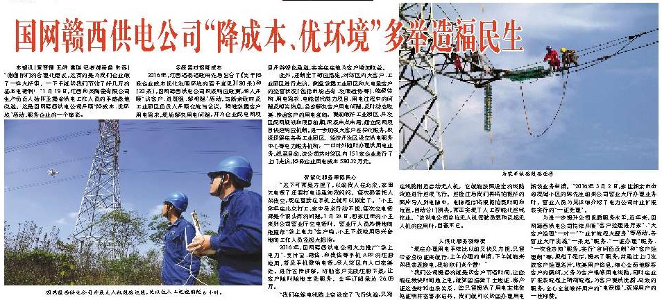 2016年,国网赣西供电公司大力推广“掌上电力”、支付宝、微信、和我信等手机APP的注册使用,普及手机缴纳电费,深入辖区内人口密集处,进行宣传讲解,协助客户完成注册下载,让客户随时随地享受服务,全年订阅量达26.09万。“我们在输电线路上空设定了飞行轨道,只需在线路附近启动无人机,它就能按照设定的线路轨迹进行巡视飞行。巡检过后我们再将拍摄好的照片导入到电脑中,电脑程序将根据拍摄时间和位置,自动分门别类,真正实现了人工智能化巡线作业。”该供电公司首位无人机驾驶员袁玮谈起无人机的应用时,自豪不已。