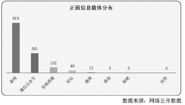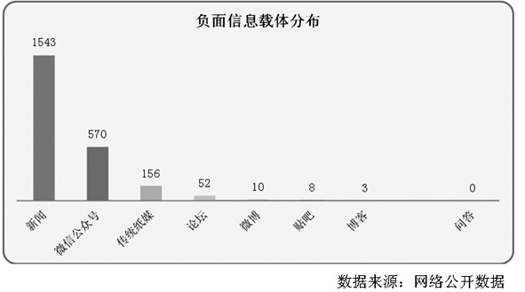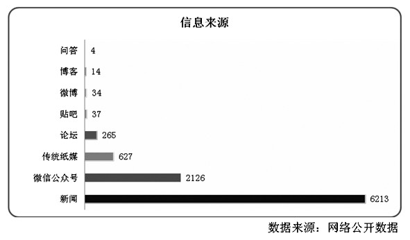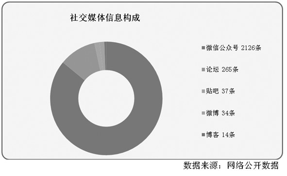 微信公众号信息量最大,高达2126条,占比22.81%;其次是论坛,信息量为265条,占比2.84%;贴吧,信息量为37条,占比0.40%;微博,信息量为34条,占比0.36%;博客,信息量为14条,占比0.15%。