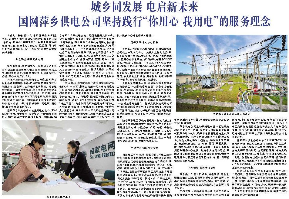 目前,为服务好分布式电源发展,做好送出工程建设,国网萍乡供电公司结合电网发展规划,创新提出了同一区域多家光伏发电企业集中上网、打捆外送的光伏发电项目并网新模式。确保了萍乡立晟达、中节能、方大、茂硕等一批光伏新能源企业以最经济环保的方式“送得出、用得上”,全面兑现分布式电源服务承诺,实现了经济效益与社会效益的双赢。 为市民提供优质服务国网萍乡供电公司加快电网建设