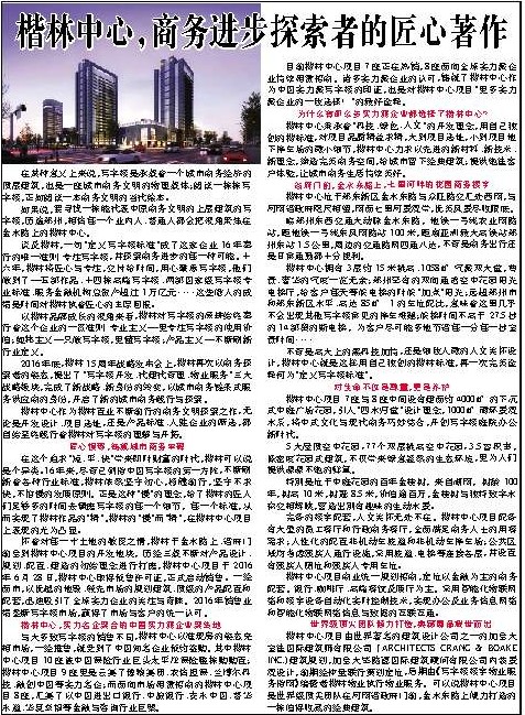 2016年底,楷林15周年战略发布会上,楷林再次以商务探索者的姿态,提出了"写字楼开发、代建代管理、物业服务"三大战略板块,完成了新战略、新身份的转变,以城市商务链条式服务供应商的身份,开启了新的城市商务践行与探索。