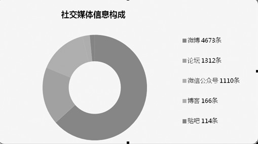 微博信息量最大,高达4673条,占比8.52%;其次是论坛,信息量为1312条,占比2.39%;微信公众号信息量为1110条,占比2.02%;博客信息量为166条,占比0.30%;贴吧信息量为114条,占比0.21%。
