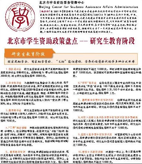 【编者按】自2007年《国务院关于建立健全普通本科高校高等职业学校和中等职业学校家庭经济困难学生资助政策体系的意见》(国发〔2007〕13号)颁布以来的十年间,中央、北京市密集出台相关资助政策措施,已建立起覆盖学前教育至研究生教育的学生资助政策体系,从制度上保障了不让一个学生因家庭经济困难而失学。北京市按照“政策导向明确、财政加大投入、经费合理分担、多元混合资助、各方责任清晰”的基本原则,结合地方实际,全面贯彻落实国家新资助政策,相继研究出台了一系列实施意见和管理办法。本期,小编带你就研究生教育阶段都有哪些资助政策进行详细盘点。 1、国家奖学金 研究生国家奖学金用于奖励市属高校中表现优异的全日制研究生。奖励标准为:博士研究生每生每年30000元、硕士研究生每生每年20000元。