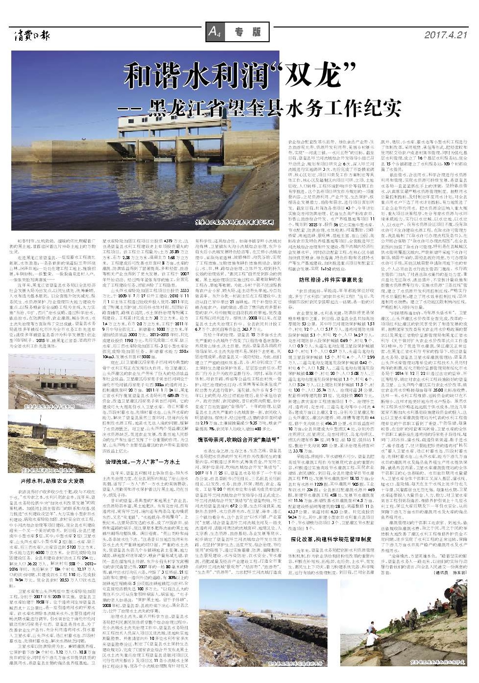 走进黑龙江省望奎县,一座座蓄水工程波光粼粼,水体盈盈;一条条崭新的渠道似玉带环绕山林,润泽田地;一处处在建工程工地上,旌旗招展,车辆如梭,一派繁荣。一股股清泉进村入户,一张张笑脸写满喜悦……