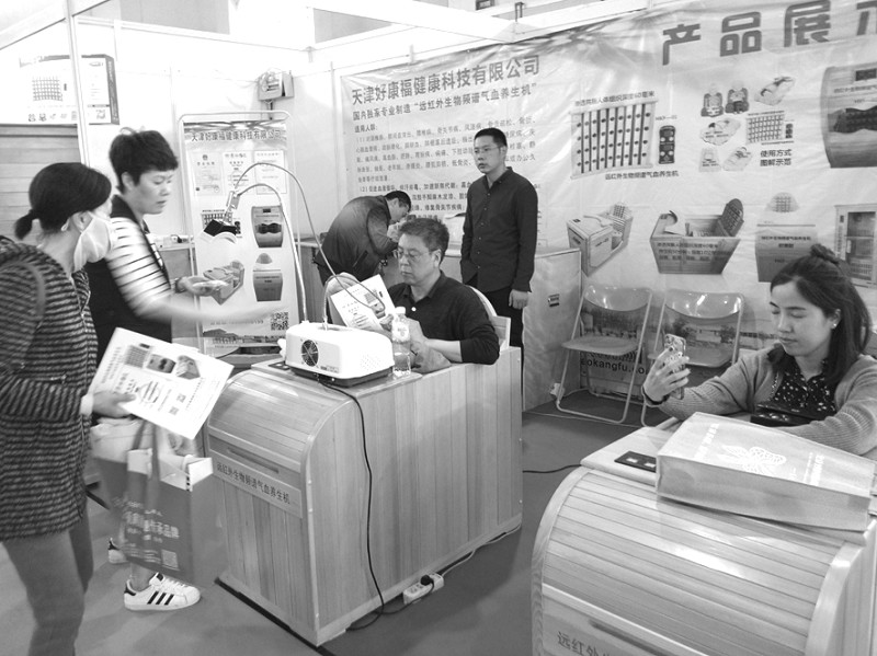 3名消费者泰然自若地坐在木桶内,有的正在刷朋友圈,有的正在看宣传册,这让记者好奇地走进这家企业一探究竟。天津好康福健康科技有限公司的负责人告诉记者,这些人是在体验可以缓解压力、改善骨关节疼痛等涵盖各种健康问题的远红外生物频谱气血养生机,这款机器避免了人们在汗蒸房内随时出现缺氧的情况,可以改善很多亚健康问题,使用50分钟相当于慢跑10公里消耗的血糖、血脂、尿酸、脂肪等,且衣服不热,只是人体表面微热。记者随后体验了一台售价1780元的作用于背部的养生机,坐上去几分钟后背部开始感觉微热,有缓解疲劳的效果。名为“科仕盾”的展区内三五顾客眼睛上面戴着仪器,松弛地躺在沙发上,工作人员介绍,这款眼部智能按摩仪只需使用15分钟,即可改善视力模糊、眼睛干燥和疲劳等症状。一家来自广东宜众堂生物科技有限公司的厂家也参加了此次会展,他们主打治疗宫寒、早衰等妇科疾病。展区内,一名顾客正在工作人员的指导下体验治疗。在亚健康越来越严重的时代背景下,大健康产业呈现出一派欣欣向荣的景象,在保留传统养生技术的同时,全国各地养生会所、智能养生仪器也顺理成章成为这个时代人们不可或缺的健康需求。但这些产品是确有作用还是“噱头”,还有待市场检验。