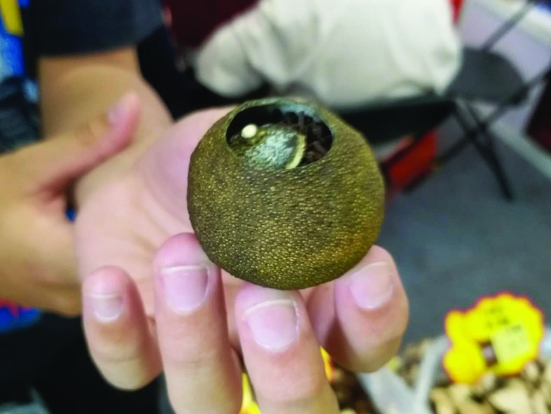工作人员拿着他家的陈皮给记者讲:“我们新会的陈皮油囊颗粒大,而且不规则。” “但是小青柑个头儿还没有长开,显不出油囊颗粒的不同,怎么区分呢?”
