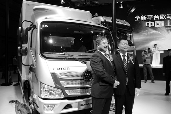 福田商用汽车集团高级副总裁顾德华和北京福田康明斯发动机有限公司党委书记詹振京为欧马可S1超级轻卡首发揭幕