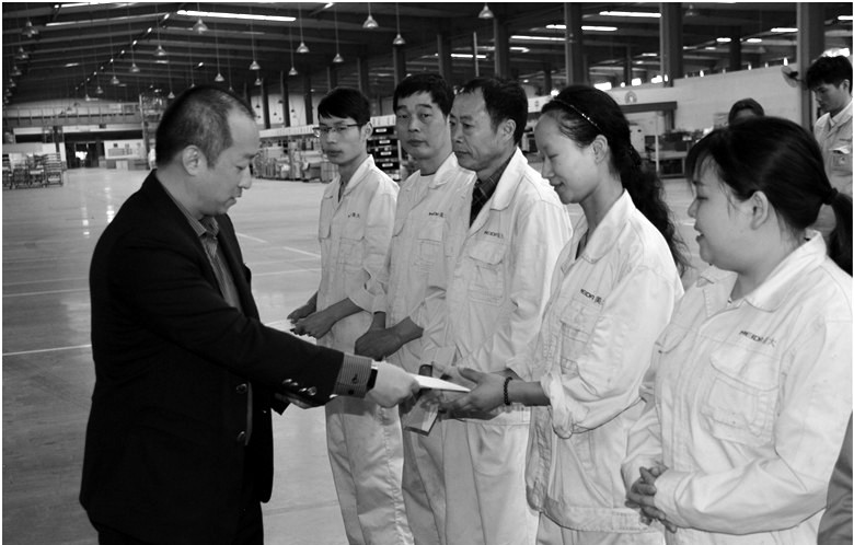 5月4日晨会上,公司总裁夏鼎博士来到生产车间为优秀班组颁发荣誉证书和奖金。夏博士表示,“五一国际劳动节”期间,检测组获得此项殊荣,非常有意义,这一荣誉是对我们成绩的肯定,希望检测组全员再接再厉,继续提高,也希望其他班组向他们学习。时值“五四青年节”,我们生产一线大多数员工都是朝气蓬勃的青年,要发挥青年人优势,勤奋钻研业务知识,不断提高操作技能,一丝不苟,追求每一台美大集成灶尽善尽美,用心打造精品,奉献给广大用户朋友。”
