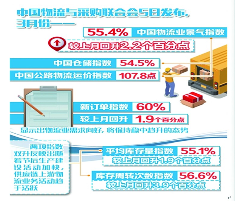 与物流从业人员数同日发布的是3月份中国物流业景气指数,中国物流与采购联合会数据公布显示为55.4%,较上月回升2.2个百分点。