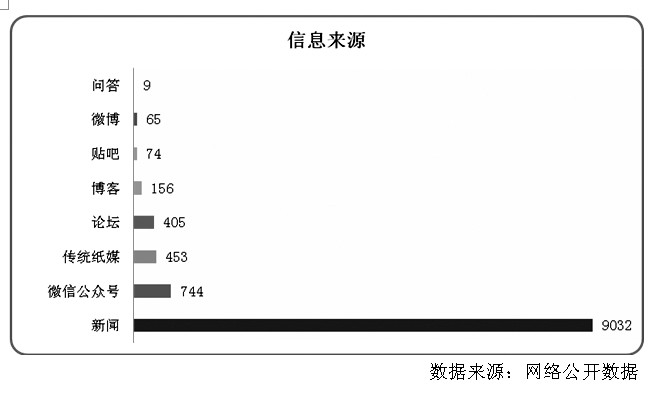 在月度监测周期内,网络新闻9032条,微信公众号744条,传统纸媒453条,论坛405条,博客156条,贴吧74条,微博65条,问答9条。