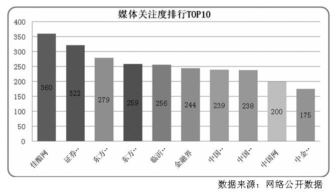监测期内,佳酿网、证券之星、东方财富网股吧、居榜单前三位,是最为关注其网络动态的新闻媒体。其中,佳酿网出稿量360篇次,证券之星出稿量322篇次,东方财富网股吧出稿量279篇次,东方财富网出稿量259篇次,临沂信息港出稿量256篇次,金融界出稿量244篇次,中国新闻周刊出稿量239篇次,中国经济网出稿量238篇次,中国网出稿量200篇次,中金在线出稿量175篇次。