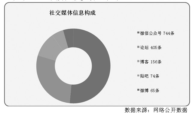 微信公众号信息量最大,高达744条,占比6.80%;其次是论坛,信息量为405条,占比3.70%;博客,信息量为156条,占比1.43%;贴吧,信息量为74条,占比0.68%;微博,信息量为65条,占比0.59%。