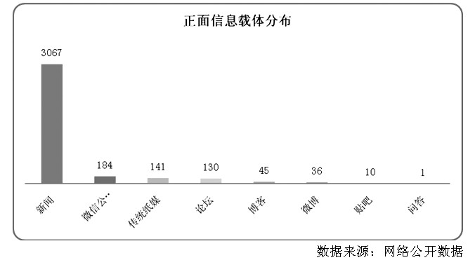 监测期内,正面信息载体分布中,新闻的传播量最高,共计3067条。