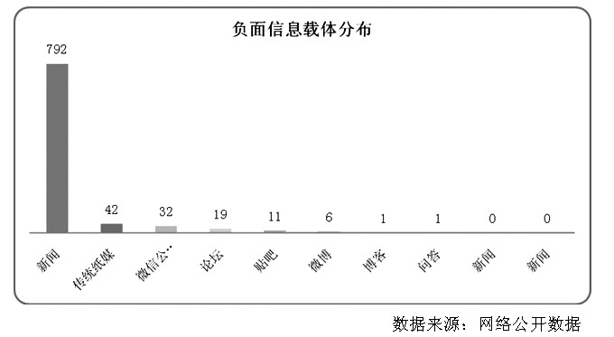 监测期内,负面信息载体分布中,新闻的传播量最高,共计792条,其次是传统纸媒42条,微信公众号32条,论坛19条,贴吧11条,微博6条,博客1条,问答1条。