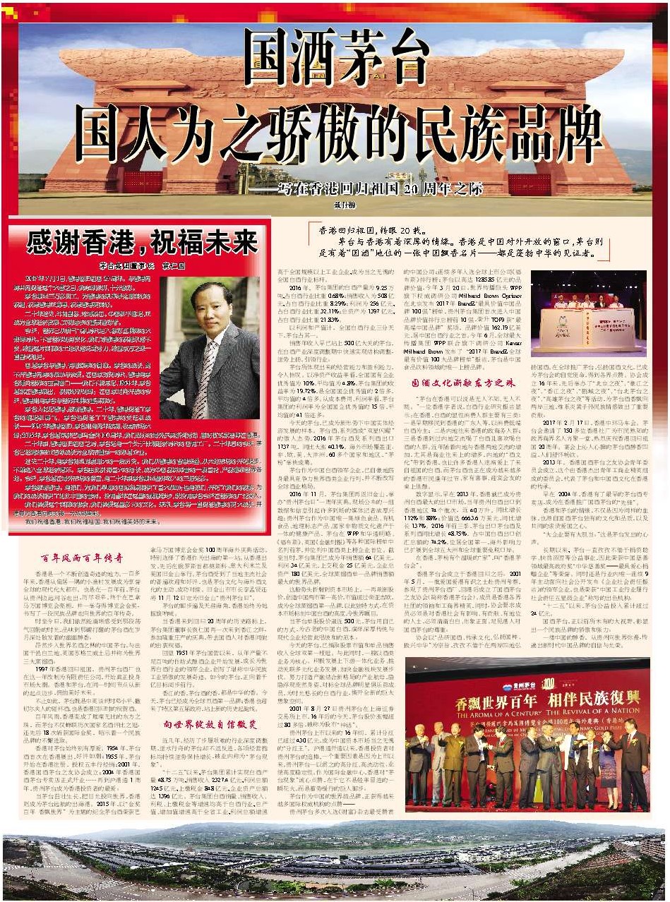 茅台与香港有着深厚的情缘。香港是中国对外开放的窗口,茅台则是有着“国酒”地位的一张中国飘香名片——都是蓬勃中华的见证者。 感谢香港,祝福未来 茅台集团董事长 袁仁国