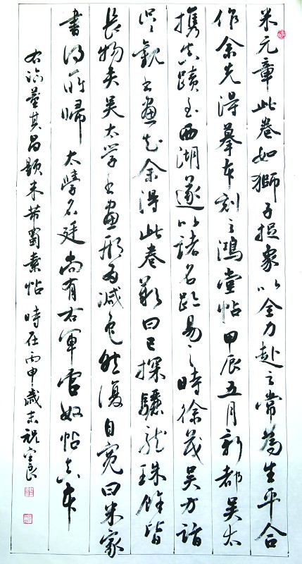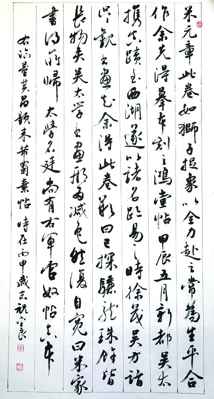 书法要经得起时间的检验,最终得看人和作品,人就是书法家的修养、学识、品格;作品就是你的创作能不能真正打动人,能否让更多的人从中获得美的愉悦。祝金良曾经十分认真地对我说:“我最瞧不起的就是那些华而不实,沽名钓誉,故弄玄虚,说什么以丑为美的书法家。这样的书法家无论他头上的光环有多么耀眼,身价有多么不菲,都只能是昙花一现,为人们所不齿的另类。”他还说,书法艺术的土壤是人民群众,如果你的东西人民群众不认可,只是少数人在那里互相吹吹拍拍“阳春白雪,和者盖寡”,那么你的“艺术”还有什么意义。