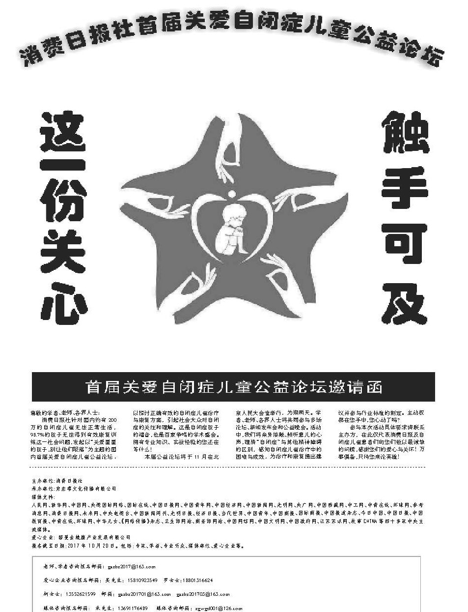 参与本次活动具体要求请联系主办方,在此仅代表消费日报及自闭症儿童患者们向您们致以最诚挚的问候,感谢您们的爱心与关怀!万事俱备,只待您来论英雄! 主办单位:消费日报社承办单位:京宏粤文化传播有限公司媒体支持: 人民网、新华网、中国网、央视国际网络、国际在线、中国日报网、中国青年网、中国经济网、中国新闻网、光明网、央广网、中国西藏网、中工网、中青在线、环球网、参考消息网、消费日报网、未来网、中央电视台、中国新闻周刊、光明日报、经济日报、当代世界、中国青年、中国商报、国际商报、中国报道杂志、今日中国、中国日报、中国教育报、中青在线、环球网、中华儿女、《网络传播》杂志、卫生部网站、商务部网站、中国网信网、中国文明网、中国政府网、江苏苏讯网、故事CHINA等四十多家中央主流媒体。爱心企业: 茵曼金健康产业发展有限公司报名截至日期:2017年10月20日。包括:专家、学者、专业听众、媒体单位、爱心企业等。 老师、学者咨询报名邮箱:gazbz2017@163.com 爱心企业咨询报名邮箱:吴先生:15810923549 罗女士:18801316624 柯女士:13552621599 邮箱:gazbz201701@163.com gazbz201703@163.com 媒体咨询报名邮箱: 朱先生:13691176489 媒体咨询邮箱:zgwgd001@126.com