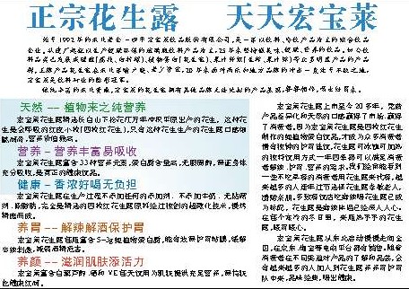 宏宝莱花生露精选长白山下松花江万年冲积平原出产的花生,这种花生是会呼吸的红皮小粒(四粒红花生),只有这种花生生产的花生露口感细腻润滑,营养价值最高。 营养-营养丰富易吸收