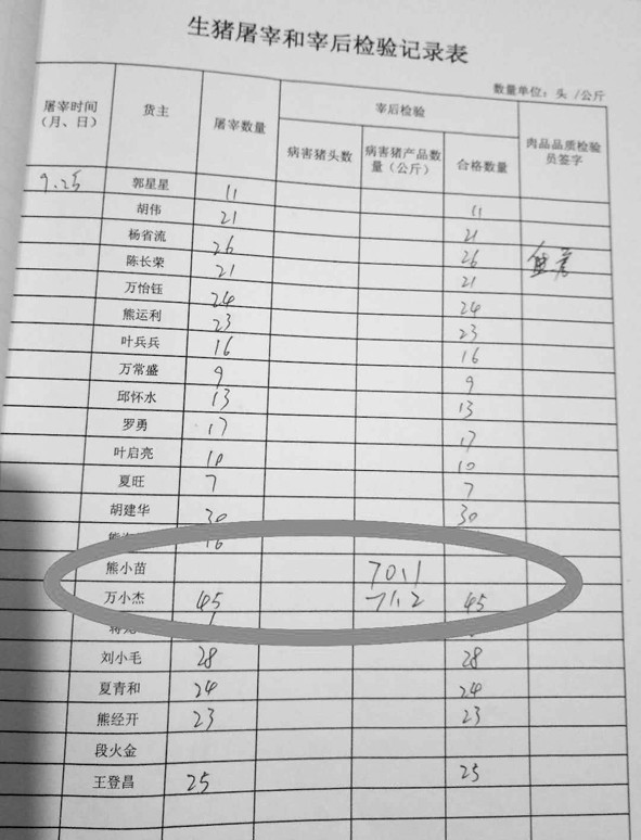 在9月25日的《生猪屠宰和宰后检验记录表》中反映出管理乱象,屠宰户熊小苗没有屠宰量却有70.1公斤的病害猪,而万小杰屠宰量为45头,病害猪71.2公斤,合格数量还是45头,也没有记载病害猪如何处理。此表显示该屠宰场有猪肉屠宰批发22户,屠宰数量395头。