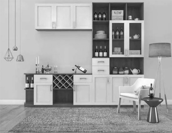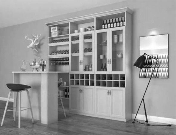 ◆大部分家庭都会选择一字型酒柜的设计,放上酒瓶、精致摆件等装饰品,使酒柜集藏酒、收纳与装饰功能为一体,闲暇的时候在月下独酌或是把酒言欢,品酒、喝茶、聊天,不失为一个休闲的小天地。 隔断式酒柜