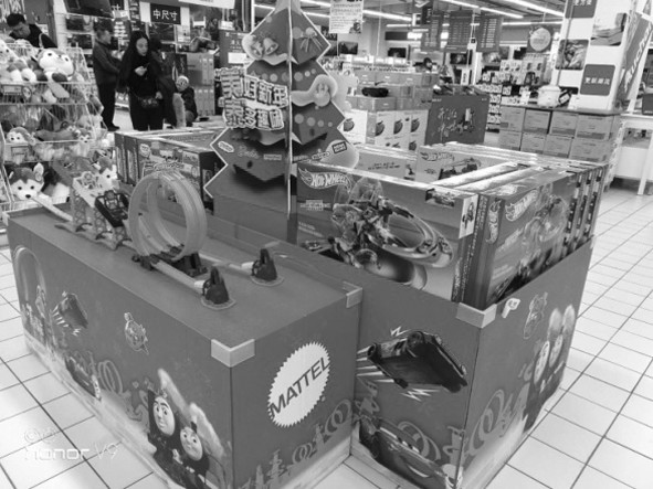 因为受众低龄化,聪明的商家特意把零食、玩具等小孩子喜欢的商品摆放在旁边,也起到了促销的作用。