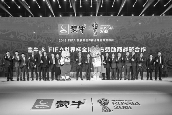 2017年12月20日上午,蒙牛集团与国际足联在北京国家会议中心联合宣布,蒙牛正式成为2018年世界杯全球官方赞助商。蒙牛旗下4大品类产品获得了“国际足联世界杯官方饮用酸奶”、“国际足联世界杯官方预制冰淇淋”和“国际足联世界杯大中华区官方牛奶”、“国际足联世界杯大中华区官方奶粉”的殊荣。更值得骄傲的是,蒙牛是国际足联在全球赞助商级别首次合作的乳品品牌,也是中国食品饮料行业成为世界杯全球赞助商的第一个品牌。