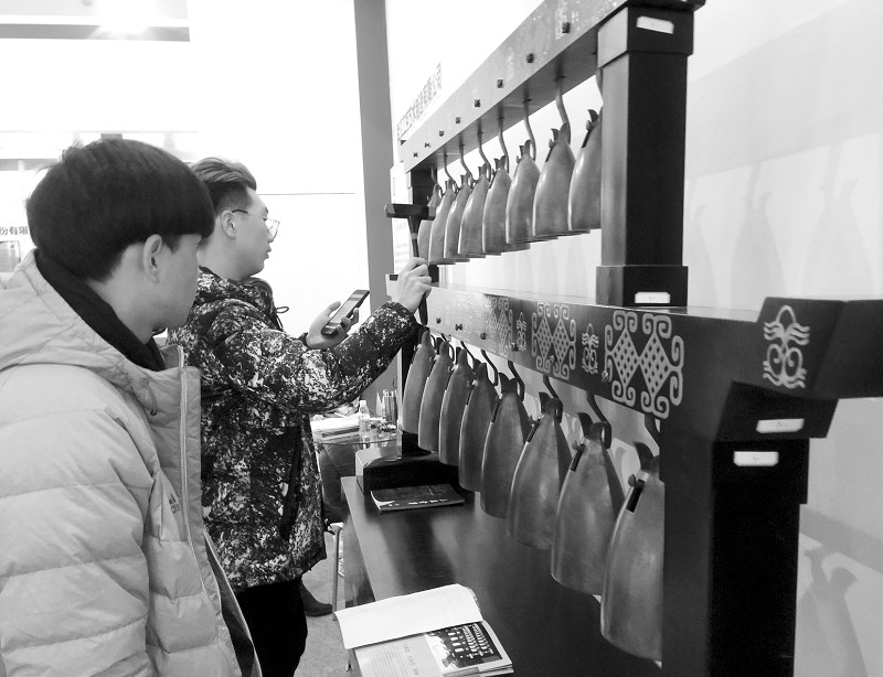 “我敲的这个工艺品和博物馆的文物是一样的吗?这回终于可以感受古代的音律了。”在北京近日举办的双创会上,一个消费者正在敲击湖北博物馆的文物“羊角钟”仿制品,像这样既有特色又好玩的博物馆衍生品正在越来越多地走入消费者家庭。 本报记者 陈丽光 摄