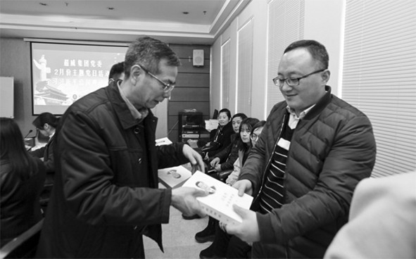 超威集团党委副书记周建民向党员们发放《习近平谈治国理政》第二卷