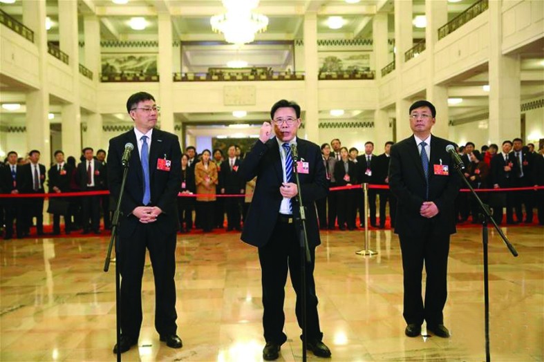 全国人大代表戴继双(右)、梁稳根(中)、孙丕恕(左)在“代表通道”接受采访。