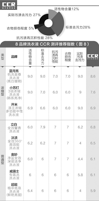 不久前,《消费者报道》向第三方权威检测机构送检了蓝月亮、小苏打、开米等3款浓缩型洗衣液以及立白、汰渍、超能、奥妙、威露士等5款普通洗衣液,测试指标包括标准去污力、实际污渍去污力、抗污渍再沉积性能、总活性物含量、衣物损伤程度等。