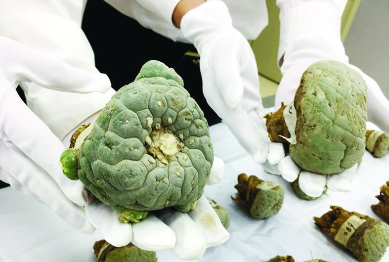 海关在通报中称,“当时这些植物就放在旅客的行李箱中,每一个都用白纸包裹着,外形是不规则的球状。我们起先还以为是水果莲雾,或是什么蘑菇。打开白纸以后,才发现全部都是多肉植物,几乎每一株都带着根系和泥土。这些多肉植物呈灰绿色或者深绿色,表皮上有一些白色的粉末,非常柔软。”意识到这类植物属于致幻类植物后,海关关员立即将该批植物暂扣。