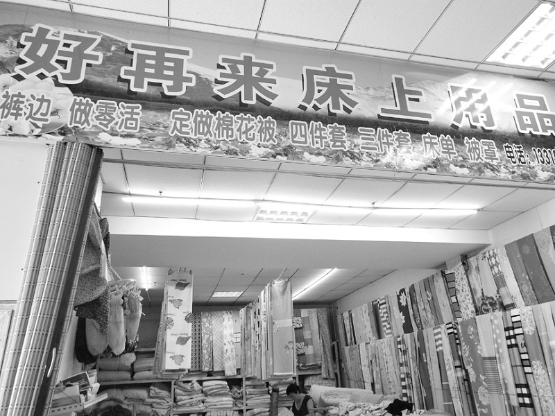 靠门口的一家床品店铺,从消费日报记者进入市场时,就一直有人在挑选被子和枕头。销售人员告诉记者,专柜的床品在这里也只能卖个白菜价,不然一床也别想卖出去。这里的居民就认低价。而另一家制作床品的店主告诉记者,暑期天气炎热,孩子也放假了。很多老顾客习惯于定制枕头和被子。因此,定做的量依然很大,这里就我一个人,经常忙不过来。