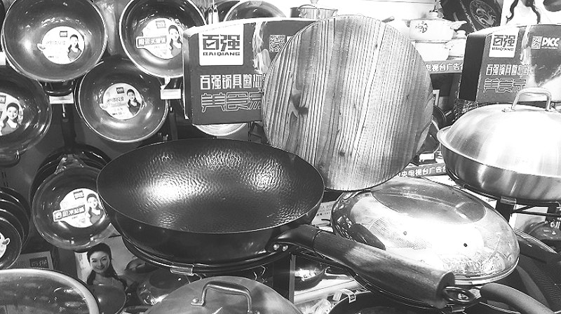 山东临沂兰田厨具不锈钢卖场是该市规模较大、货品较全的厨具市场。近日,在该卖场调查发现,一些商家公然把机器压制的铁锅当做手工铁锅出售。“卖的这锅是手工铁锅吗?”对于这样的提问,有的商家称是“纯手工锅”,有的商家称是“章丘铁锅”,更多的商家称是“高仿手工铁锅”。