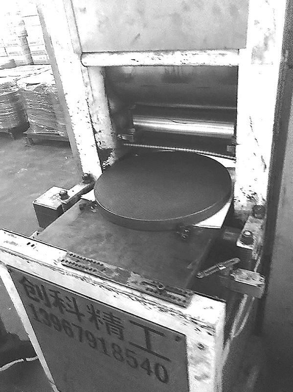 浙江永康某公司车间内用于压制“手工铁锅”锅坯锤印的模具。