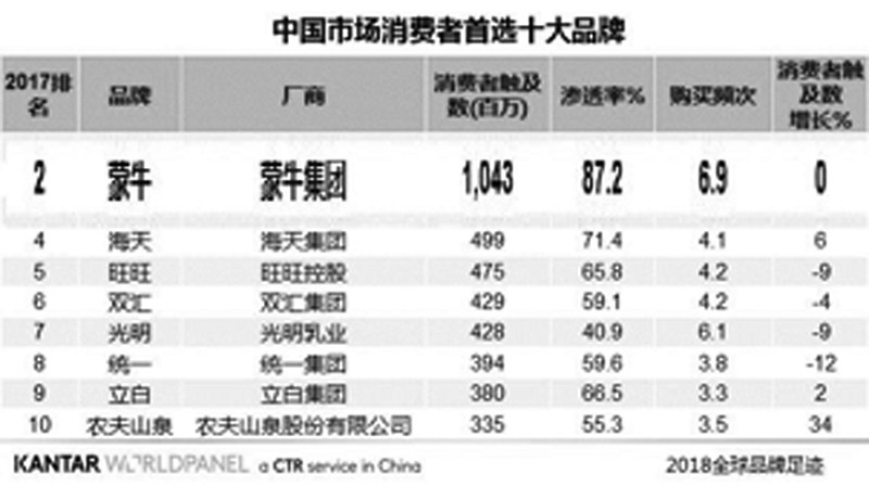 7月30日,《2018全球品牌足迹报告》中国区消费者首选前十大品牌颁奖活动在北京举行,蒙牛再次入围最受欢迎前十品牌,继续位列第二,这反映了蒙牛稳定的综合竞争力和消费者影响力。《2018全球品牌足迹报告》是由凯度消费者指数发布,这份报告揭示了消费者选择最多,最经常购买的品牌。该研究涉及五大洲的43个国家与地区,覆盖10亿消费家户,占全球人口数量的73%,涵盖全球75%的GDP。凯度消费者指数监测全球200个快速消费品品类,研究消费者真实客观的消费行为,以真实的购买选择数据,清晰诠释全球消费者与品牌的接触。报告显示,蒙牛是中国消费者选择超过10亿人次的品牌,真实反应了中国消费者的品牌偏爱倾向。