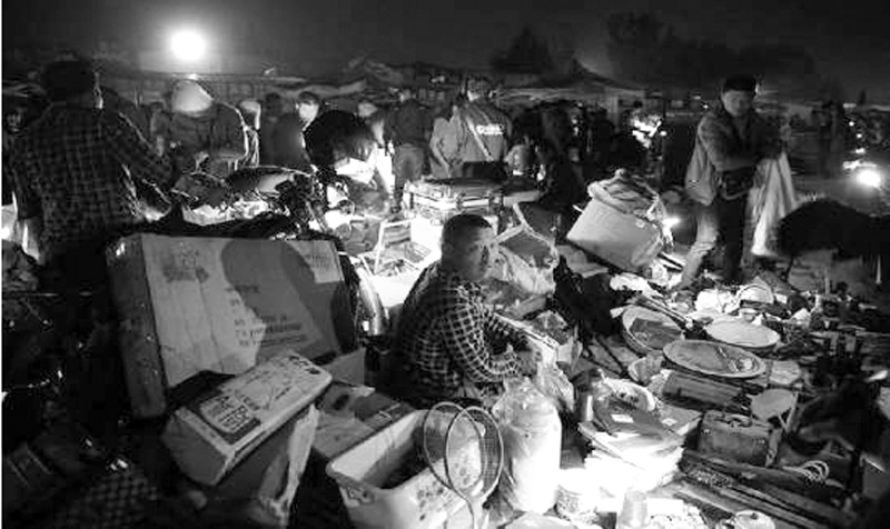 午夜12点夜市已经是人声鼎沸了,天津、河北等外地商户开着汽车,小本经营的商贩拉着小购物车,从四面八方集合在市场,陆续的开市摆摊。市场的工作人员介绍:“虽然是夜市,但是市场的管理也是十分严格的,违禁物品是一概不许销售的,市场经营的货品基本分为三个大类,一种是旧货,老式怀旧生活用品;一种是外贸尾货甩卖,商场超市退货的清售;还有一种是各类的工艺品。”